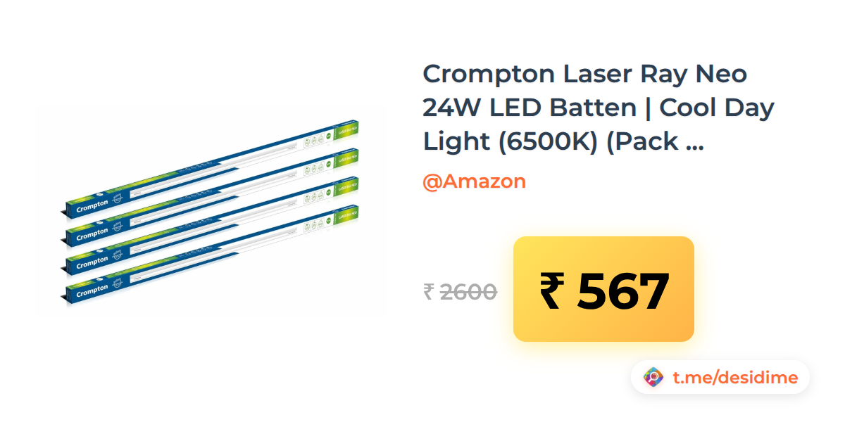 78% off on - Crompton Laser Ray Neo 24W LED Batten | Cool Day Light (6500K) (Pack of 4) - Rs. 567