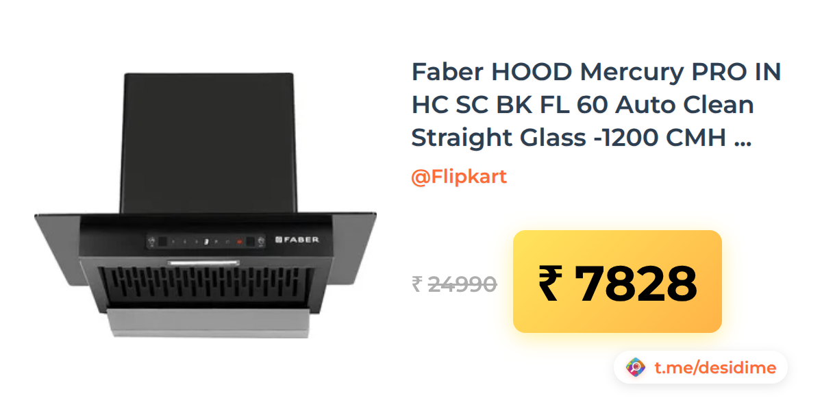69% off on - Faber HOOD Mercury PRO IN HC SC BK FL 60 Auto Clean Straight Glass -1200 CMH Chimney - Rs. 7828