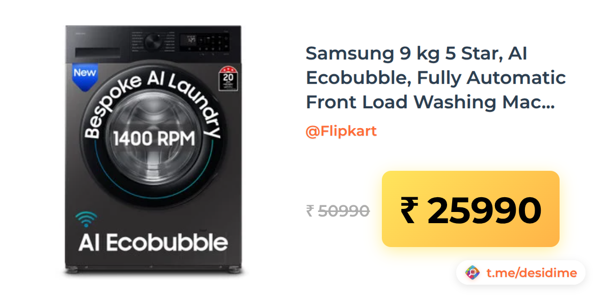49% off on - Samsung 9 kg 5 Star, AI Ecobubble, Fully Automatic Front Load Washing Machine (Grey) - Rs. 25990