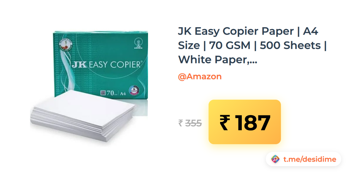 47% off on - JK Easy Copier Paper | A4 Size | 70 GSM | 500 Sheets | White Paper, 1 Ream | For Laserjet & Inkjet Printer | Fast Drying | Both Side Print | Eco Friendly | ColorLok (Pack of 1) | One Ream - Rs. 187