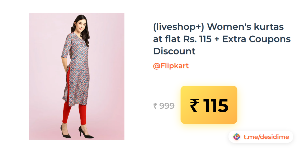 88% off on - (liveshop+) Women's kurtas at flat Rs. 115 + Extra Coupons Discount - Rs. 115