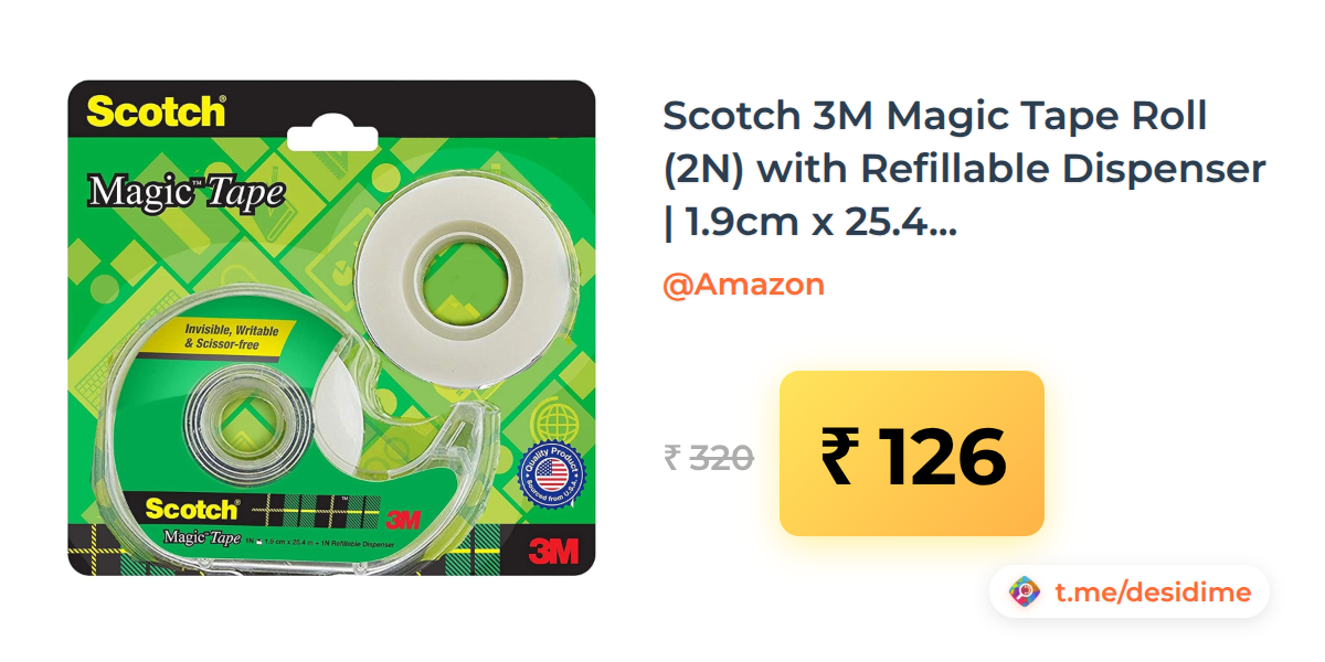 61% off on - Scotch 3M Magic Tape Roll (2N) with Refillable Dispenser | 1.9cm x 25.4 Meter - Rs. 126