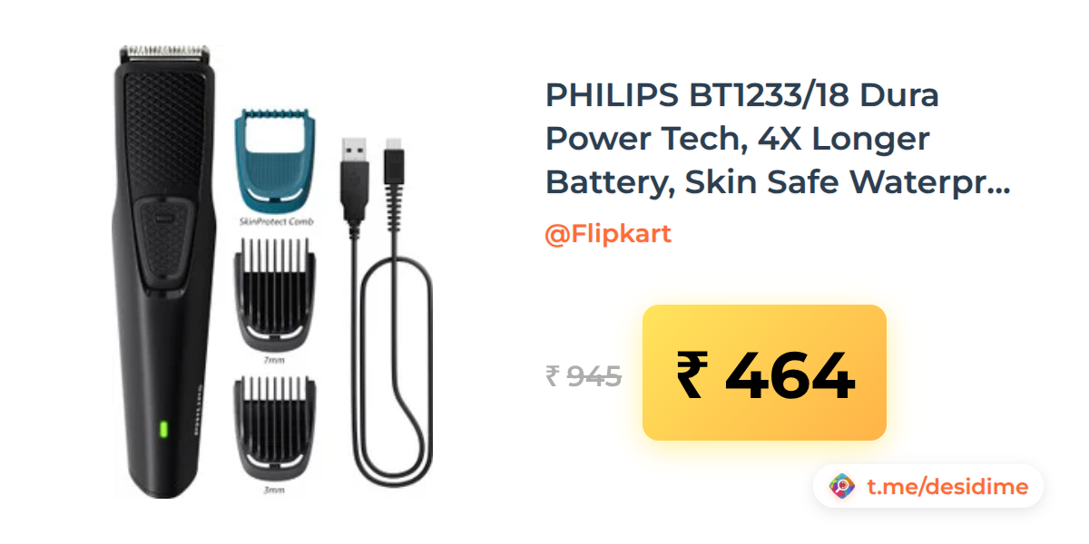 51% off on - PHILIPS BT1233/18 Dura Power Tech, 4X Longer Battery, Skin Safe Waterproof Beard Trimmer 30 min - Rs. 464