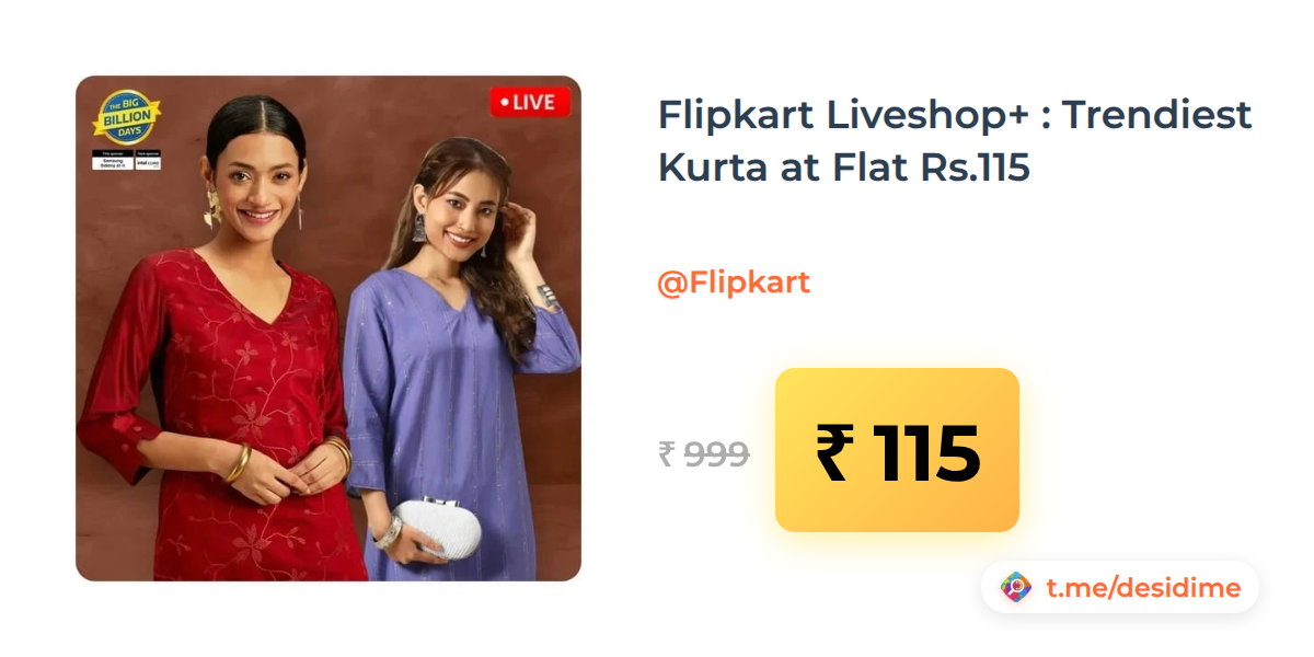 88% off on - Flipkart Liveshop+ : Trendiest Kurta at Flat Rs.115 - Rs. 115