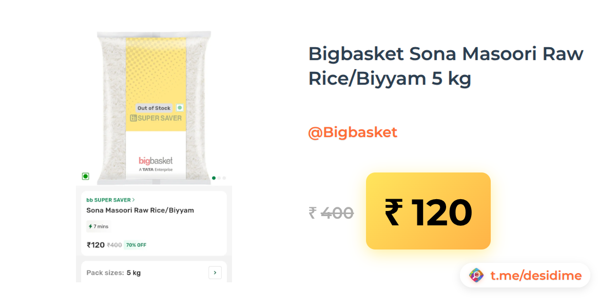 70% off on - Bigbasket Sona Masoori Raw Rice/Biyyam 5 kg - Rs. 120
