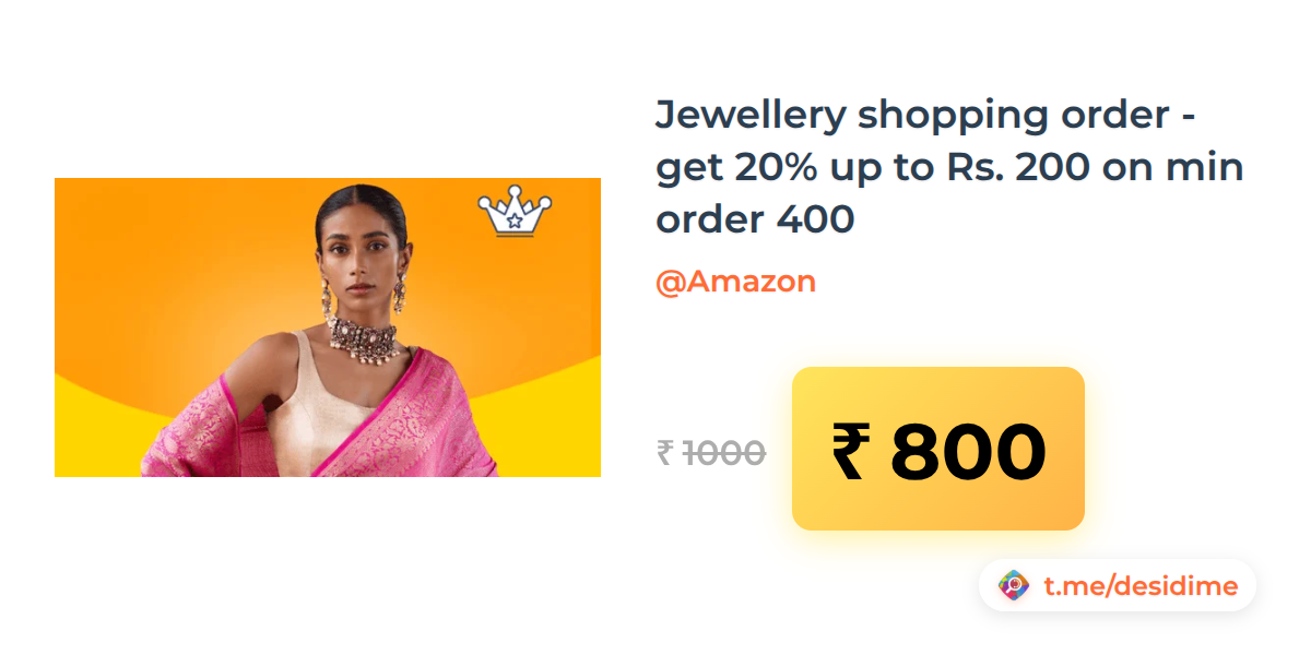 20% off on - Jewellery shopping order - get 20% up to Rs. 200 on min order 400 - Rs. 800