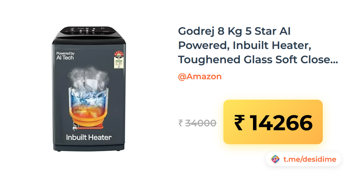 58% off on - Godrej 8 Kg 5 Star AI Powered, Inbuilt Heater, Toughened Glass Soft Close Lid, Fully Automatic Top Load Washing Machine - Rs. 14266
