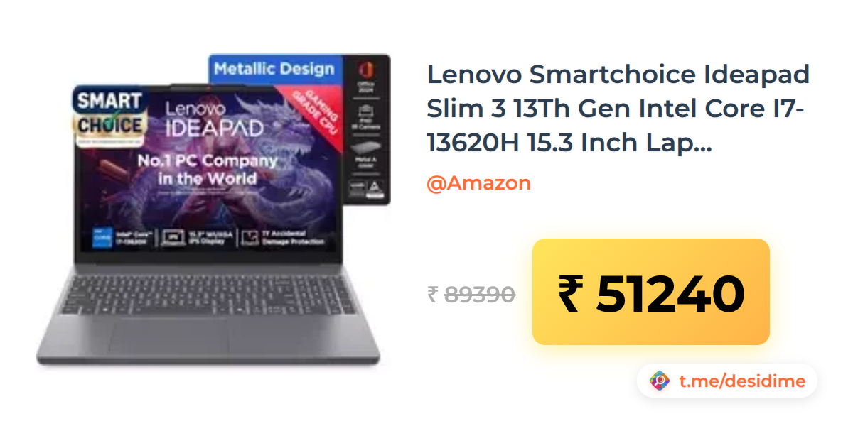 43% off on - Lenovo Smartchoice Ideapad Slim 3 13Th Gen Intel Core I7-13620H 15.3 Inch Laptop(16GB RAM/512GB SSD) - Rs. 51240