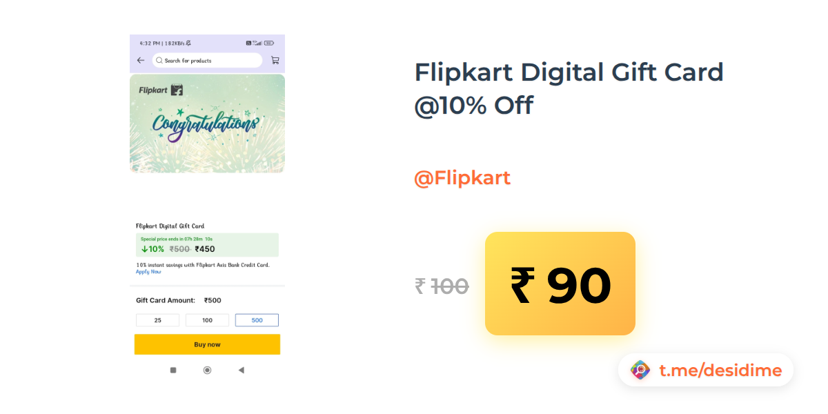 10% off on - Flipkart Digital Gift Card @10% Off - Rs. 90