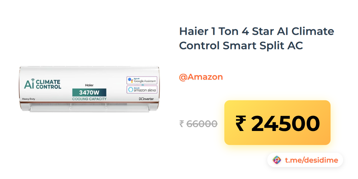 63% off on - Haier 1 Ton 4 Star AI Climate Control Smart Split AC - Rs. 24500