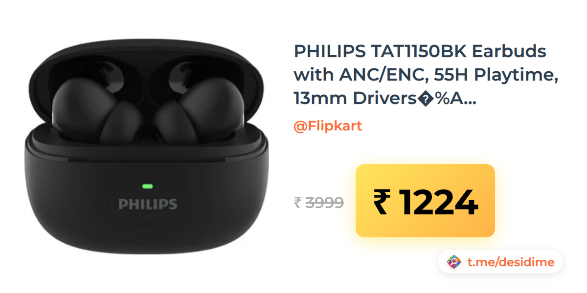 69% off on - PHILIPS TAT1150BK Earbuds with ANC/ENC, 55H Playtime, 13mm Drivers (Deep Black, True Wireless) - Rs. 1224