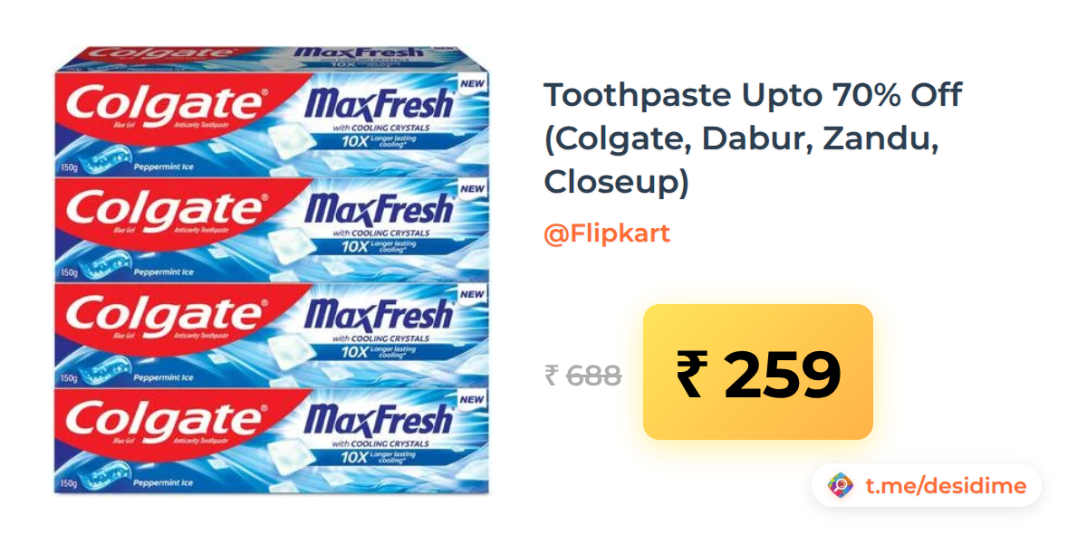 62% off on - Toothpaste Upto 70% Off (Colgate, Dabur, Zandu, Closeup) - Rs. 259