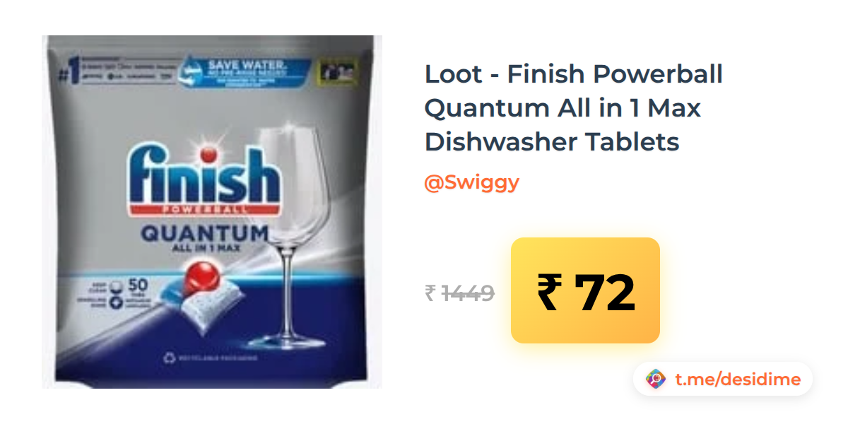 95% off on - Loot - Finish Powerball Quantum All in 1 Max Dishwasher Tablets - Rs. 72