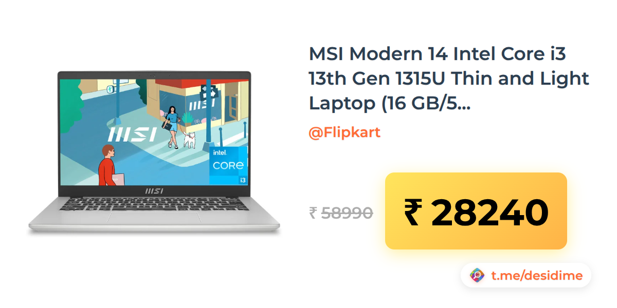 52% off on - MSI Modern 14 Intel Core i3 13th Gen 1315U Thin and Light Laptop (16 GB/512 GB SSD) - Rs. 28240