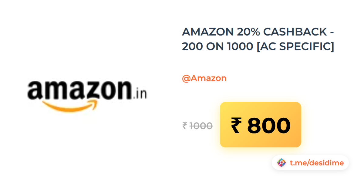 20% off on - AMAZON 20% CASHBACK - 200 ON 1000 [AC SPECIFIC] - Rs. 800