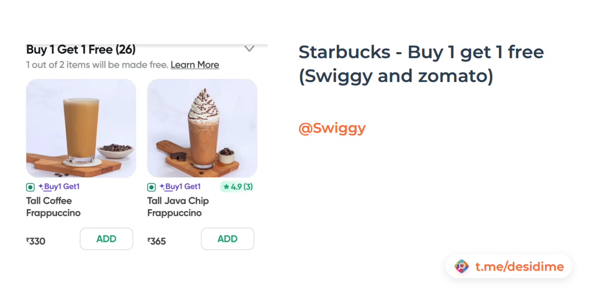 Starbucks - Buy 1 get 1 free (Swiggy and zomato)