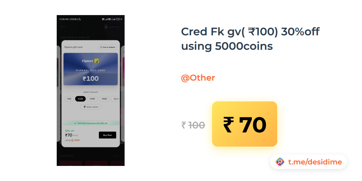 30% off on - Cred Fk gv( ₹100) 30%off using 5000coins - Rs. 70