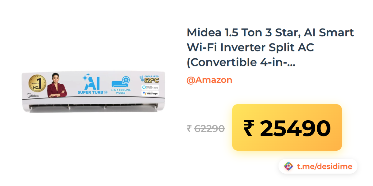 59% off on - Midea 1.5 Ton 3 Star, AI Smart Wi-Fi Inverter Split AC (Convertible 4-in-1 Cooling at 52℃,White) - Rs. 25490