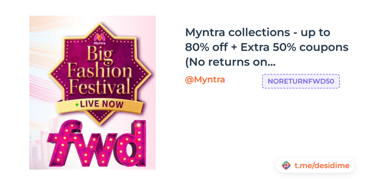 Myntra collections - up to 80% off + Extra 50% coupons (No returns only exchange )