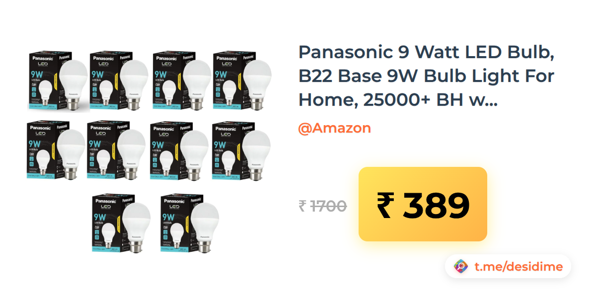 77% off on - Panasonic 9 Watt LED Bulb, B22 Base 9W Bulb Light For Home, 25000+ BH with 1 Year Warranty, 6500K Cool Day Bulb (Pack of 10) - Rs. 389