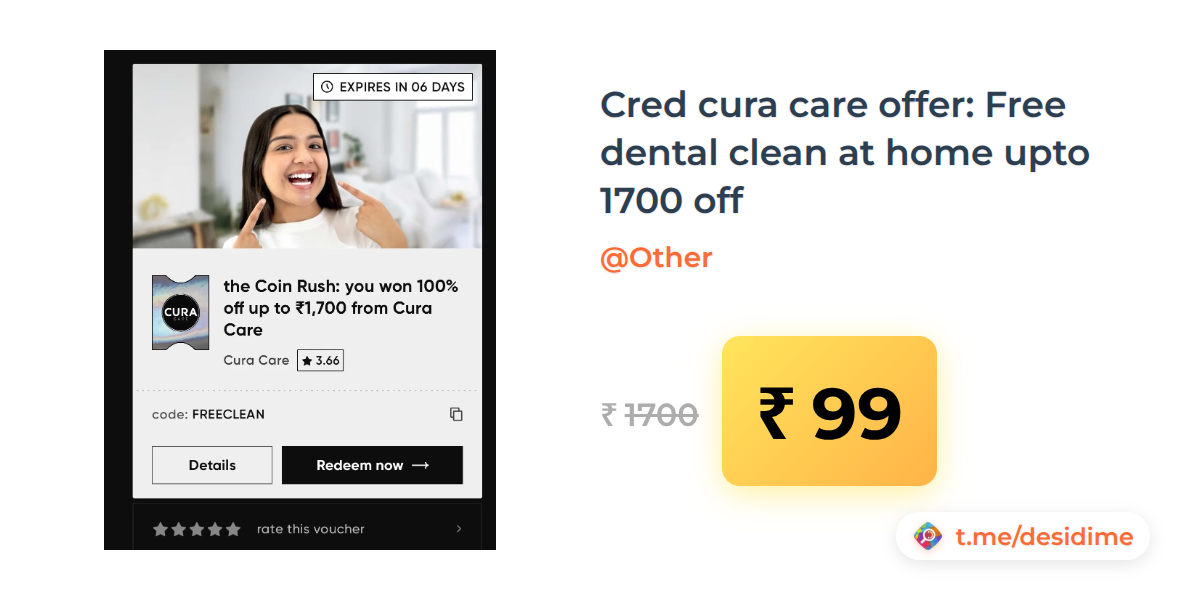 94% off on - Cred cura care offer: Free dental clean at home upto 1700 off - Rs. 99