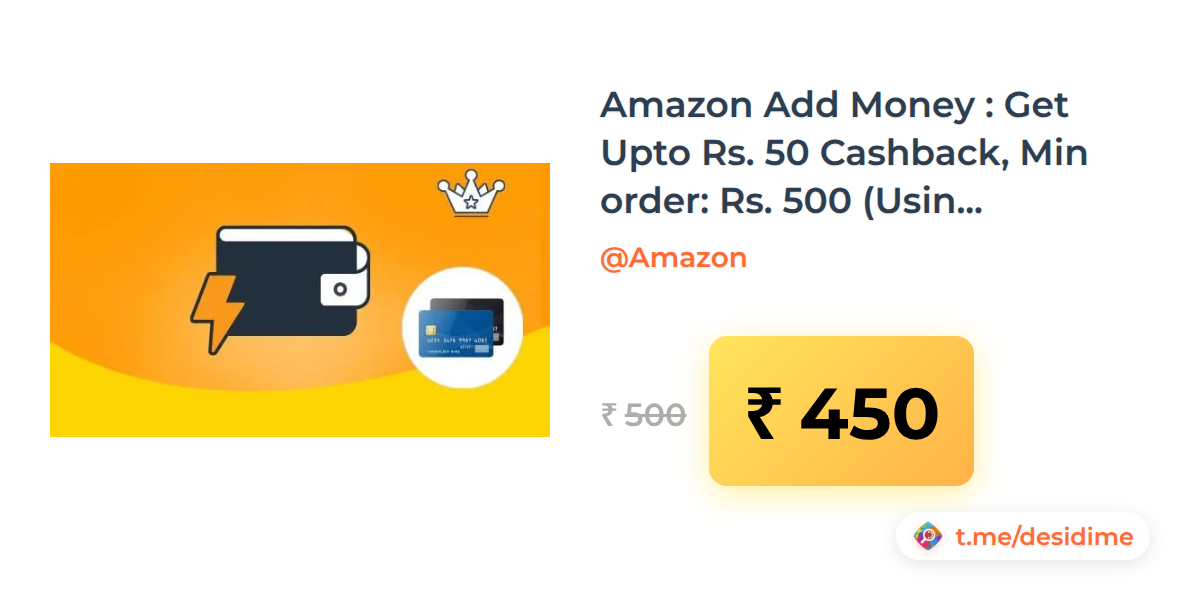 10% off on - Amazon Add Money : Get Upto Rs. 50 Cashback, Min order: Rs. 500 (Using Any Card) - Rs. 450