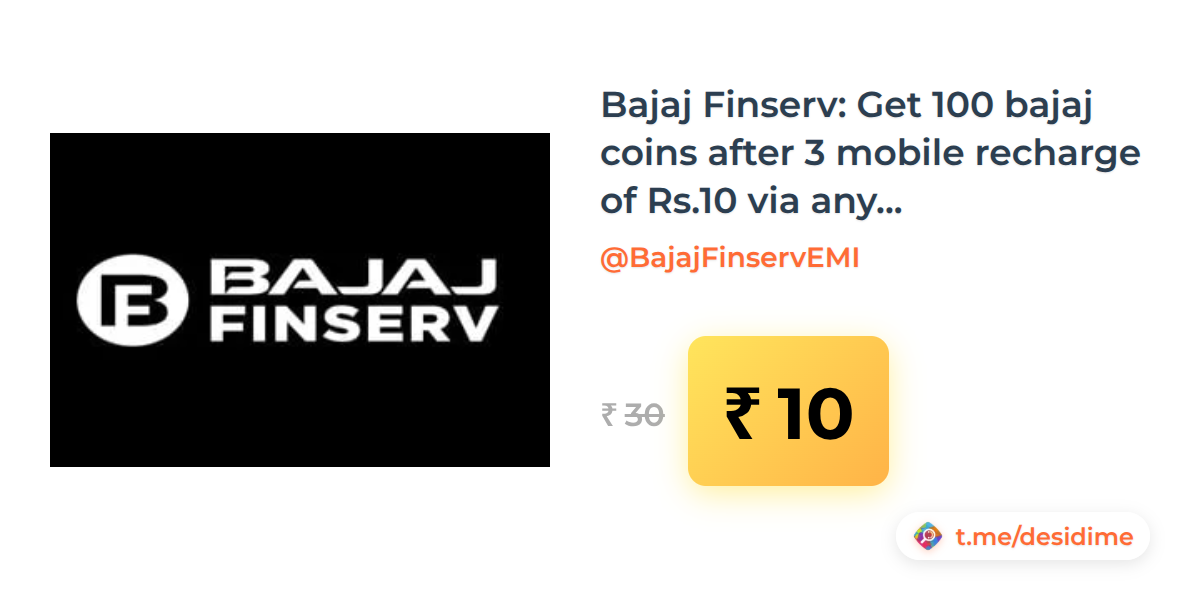 67% off on - Bajaj Finserv: Get 100 bajaj coins after 3 mobile recharge of Rs.10 via any payment mode (Oct Month) - Rs. 10