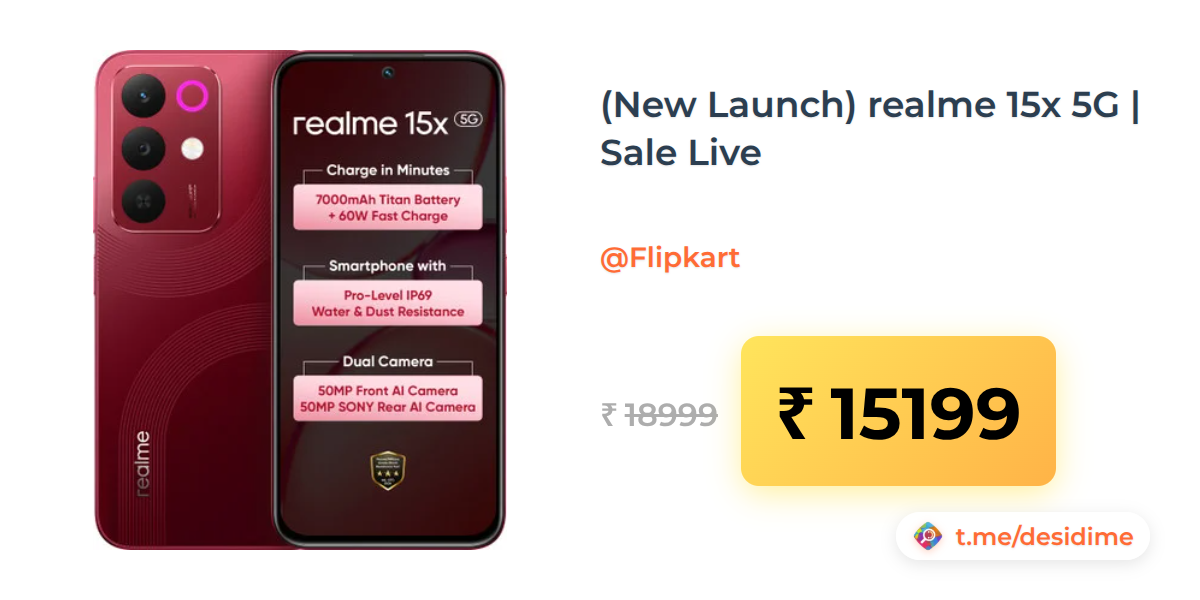 20% off on - (New Launch) realme 15x 5G | Sale Live - Rs. 15199