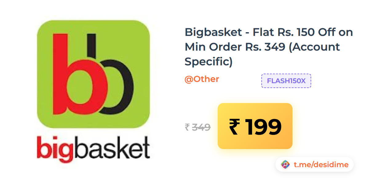 43% off on - Bigbasket - Flat Rs. 150 Off on Min Order Rs. 349 (Account Specific) - Rs. 199