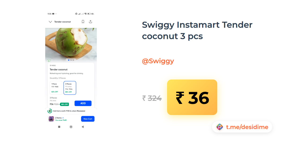 89% off on - Swiggy Instamart Tender coconut 3 pcs - Rs. 36