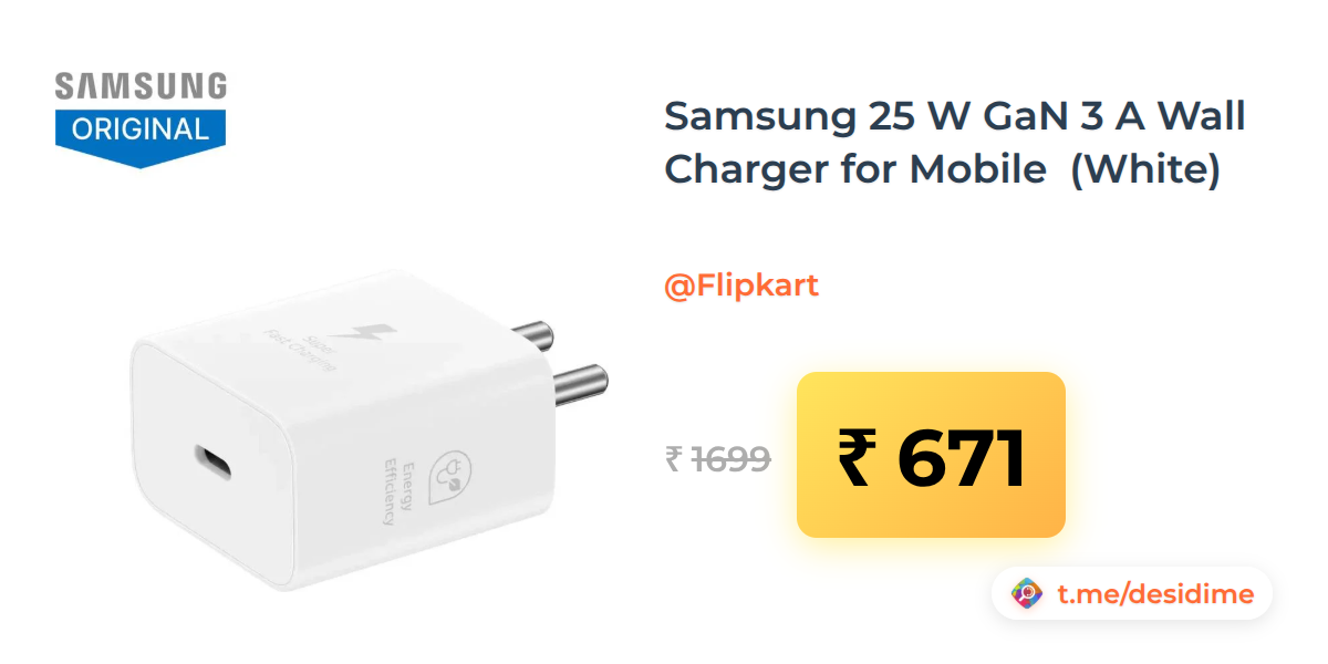 61% off on - Samsung 25 W GaN 3 A Wall Charger for Mobile (White) - Rs. 671