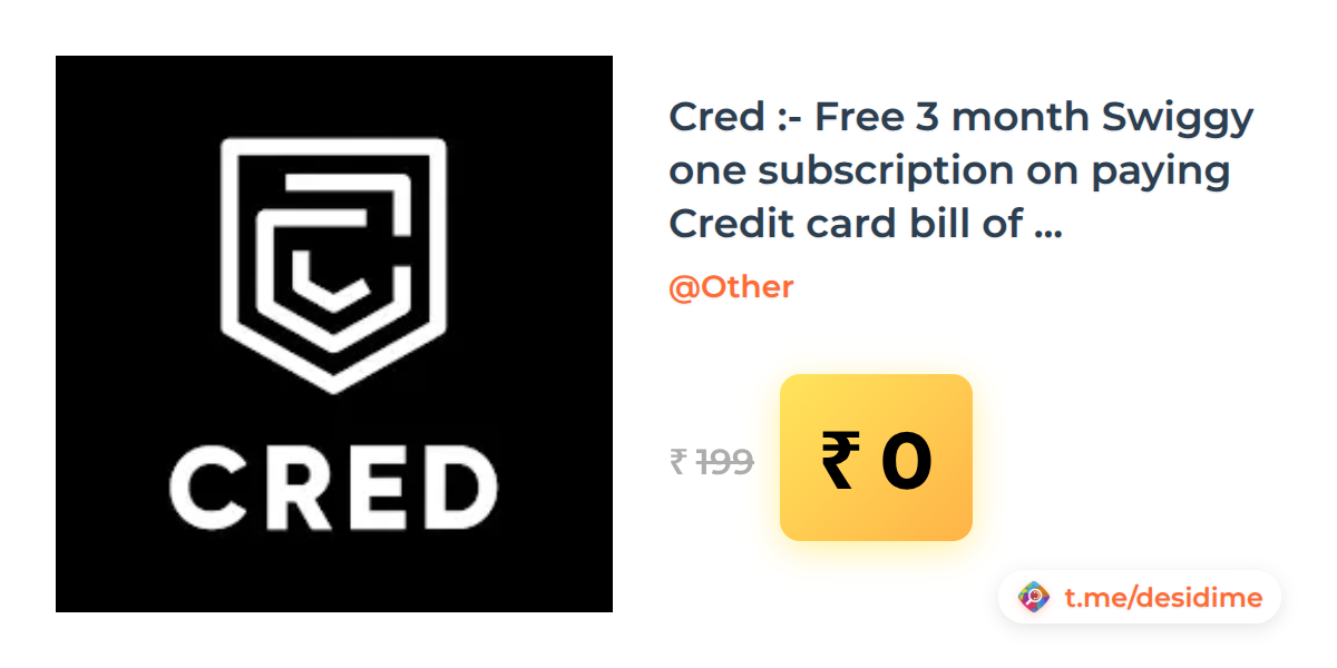100% off on - Cred :- Free 3 month Swiggy one subscription on paying Credit card bill of minimum 1000 - Rs. 0