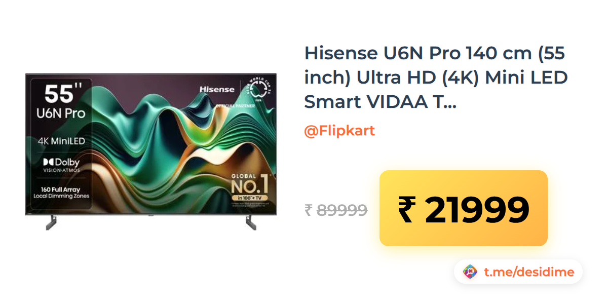 76% off on - Hisense U6N Pro 140 cm (55 inch) Ultra HD (4K) Mini LED Smart VIDAA TV with Vision Atmos, Dts Virtual X and 4K AI Upscaler - Rs. 21999