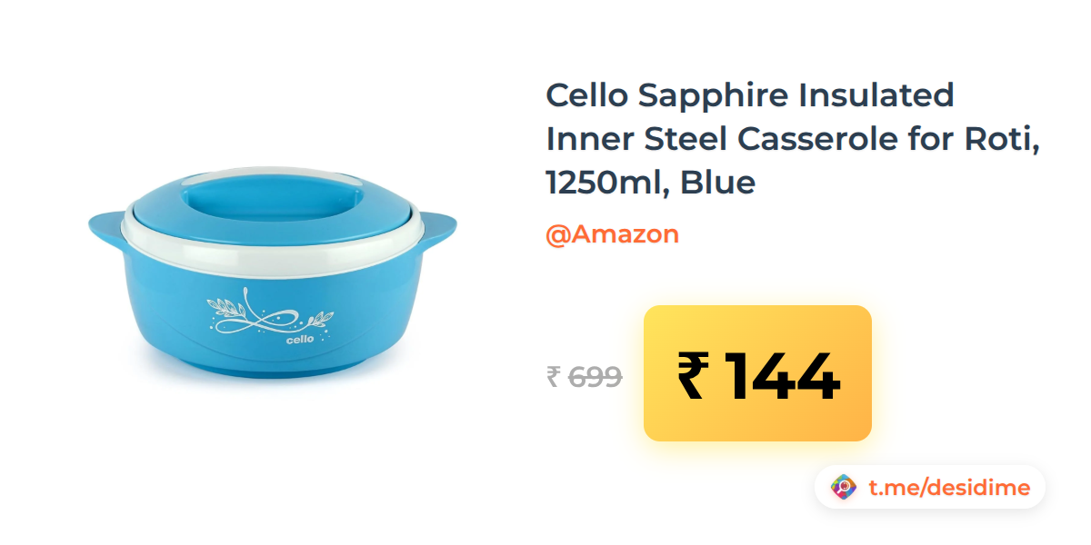 79% off on - Cello Sapphire Insulated Inner Steel Casserole for Roti, 1250ml, Blue - Rs. 144