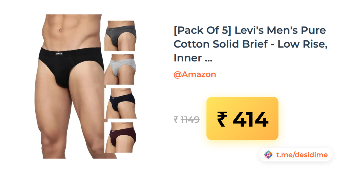 64% off on - [Pack Of 5] Levi's Men's Pure Cotton Solid Brief - Low Rise, Inner Elastic Waistband (Assorted) - Rs. 414