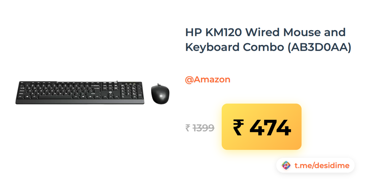 66% off on - HP KM120 Wired Mouse and Keyboard Combo (AB3D0AA) - Rs. 474