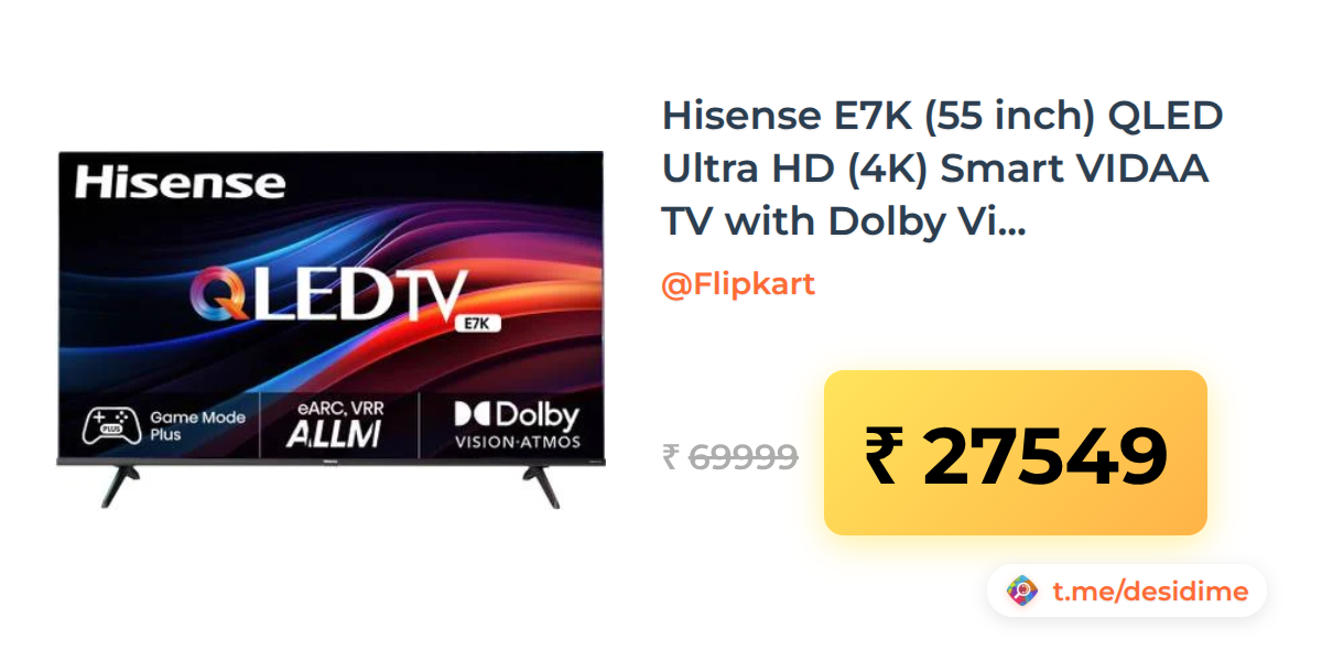 61% off on - Hisense E7K (55 inch) QLED Ultra HD (4K) Smart VIDAA TV with Dolby Vision and Atmos (55E7K) - Rs. 27549