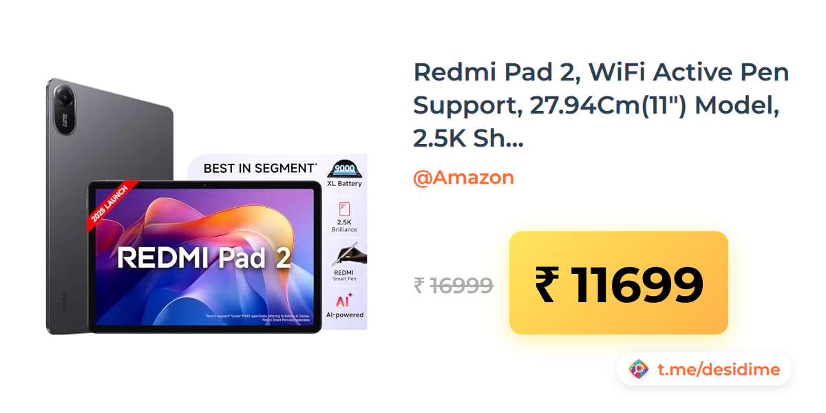 31% off on - Redmi Pad 2, WiFi Active Pen Support, 27.94Cm(11") Model, 2.5K Sharp & Clear Display, 4GB, 128GB, All Day & More 9000Mah Battery, AI-Enabled, Dolby Atmos, Hyperos 2, Graphite Grey - Rs. 11699