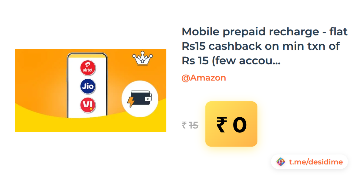 100% off on - Mobile prepaid recharge - flat Rs15 cashback on min txn of Rs 15 (few accounts) - Rs. 0