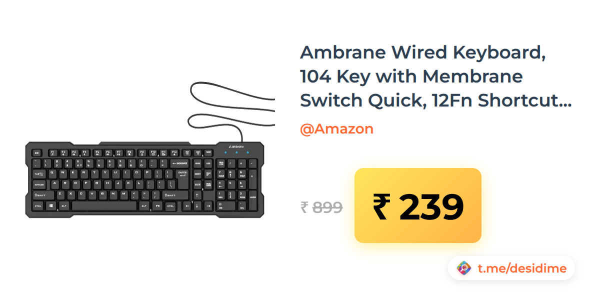 73% off on - Ambrane Wired Keyboard, 104 Key with Membrane Switch Quick, 12Fn Shortcut Keys - Rs. 239