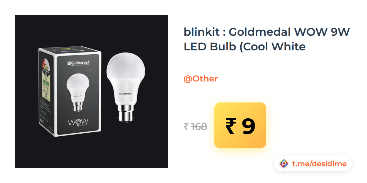 95% off on - blinkit : Goldmedal WOW 9W LED Bulb (Cool White - Rs. 9