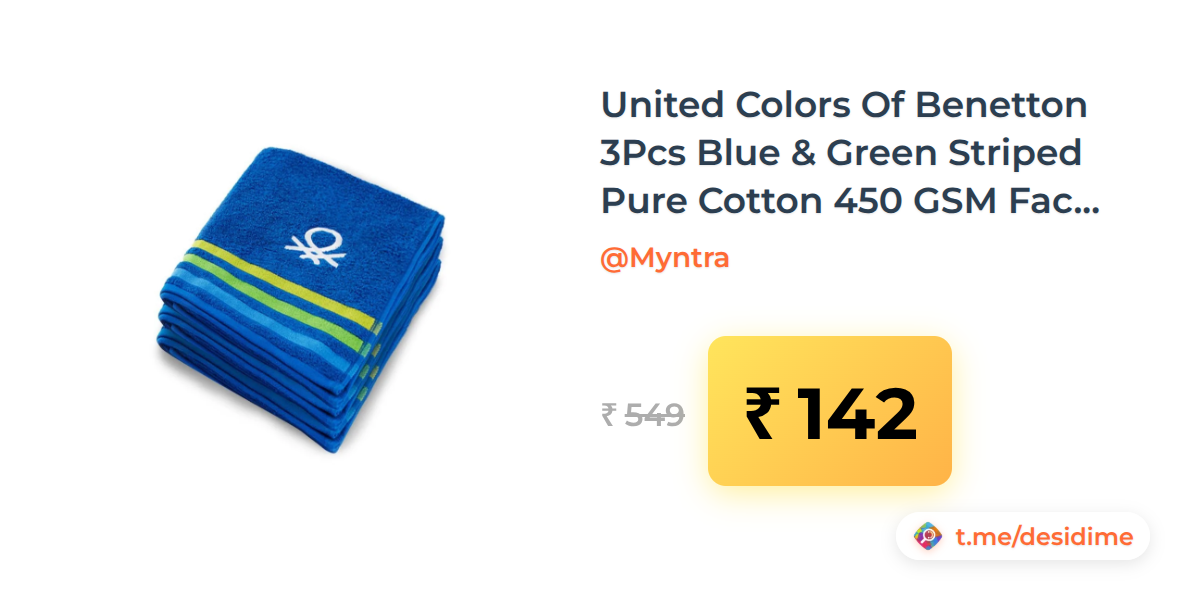 74% off on - United Colors Of Benetton 3Pcs Blue & Green Striped Pure Cotton 450 GSM Face Towels - Face Towels - Rs. 142