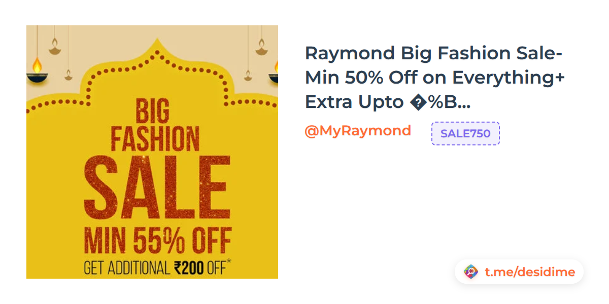 Raymond Big Fashion Sale- Min 50% Off on Everything+ Extra Upto ₹750 off