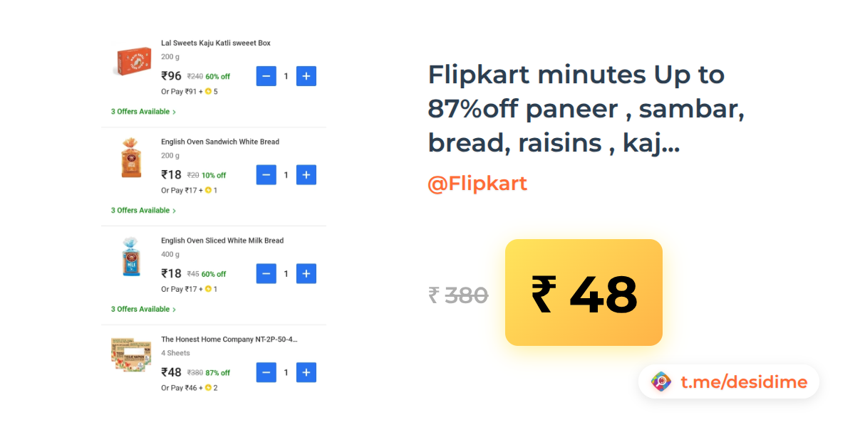 87% off on - Flipkart minutes Up to 87%off paneer , sambar, bread, raisins , kaju katli - Rs. 48