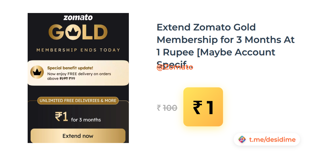 99% off on - Extend Zomato Gold Membership for 3 Months At 1 Rupee [Maybe Account Specific] - Rs. 1
