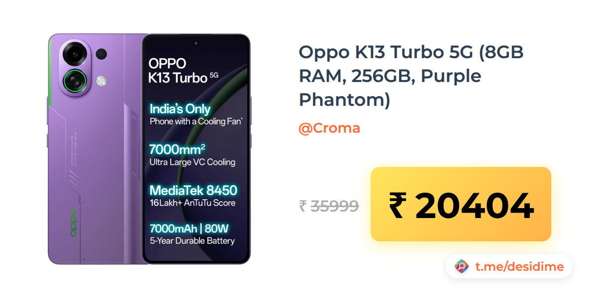 43% off on - Oppo K13 Turbo 5G (8GB RAM, 256GB, Purple Phantom) - Rs. 20404