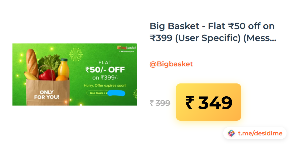13% off on - Big Basket - Flat ₹50 off on ₹399 (User Specific) (Message Received on WhatsApp) - Rs. 349