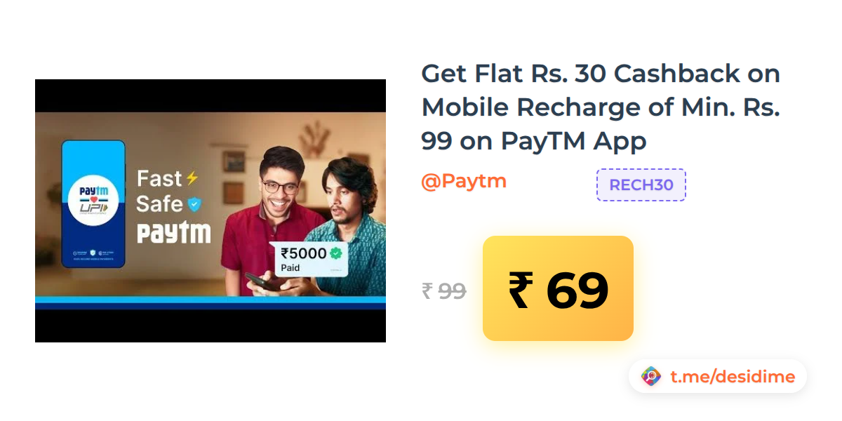 30% off on - Get Flat Rs. 30 Cashback on Mobile Recharge of Min. Rs. 99 on PayTM App - Rs. 69