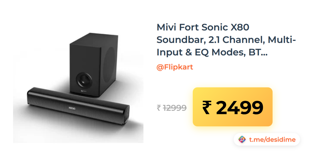 81% off on - Mivi Fort Sonic X80 Soundbar, 2.1 Channel, Multi-Input & EQ Modes, BT v5.3 90 W Bluetooth Soundbar  (Black, Grey, 2.1 Channel) - Rs. 2499