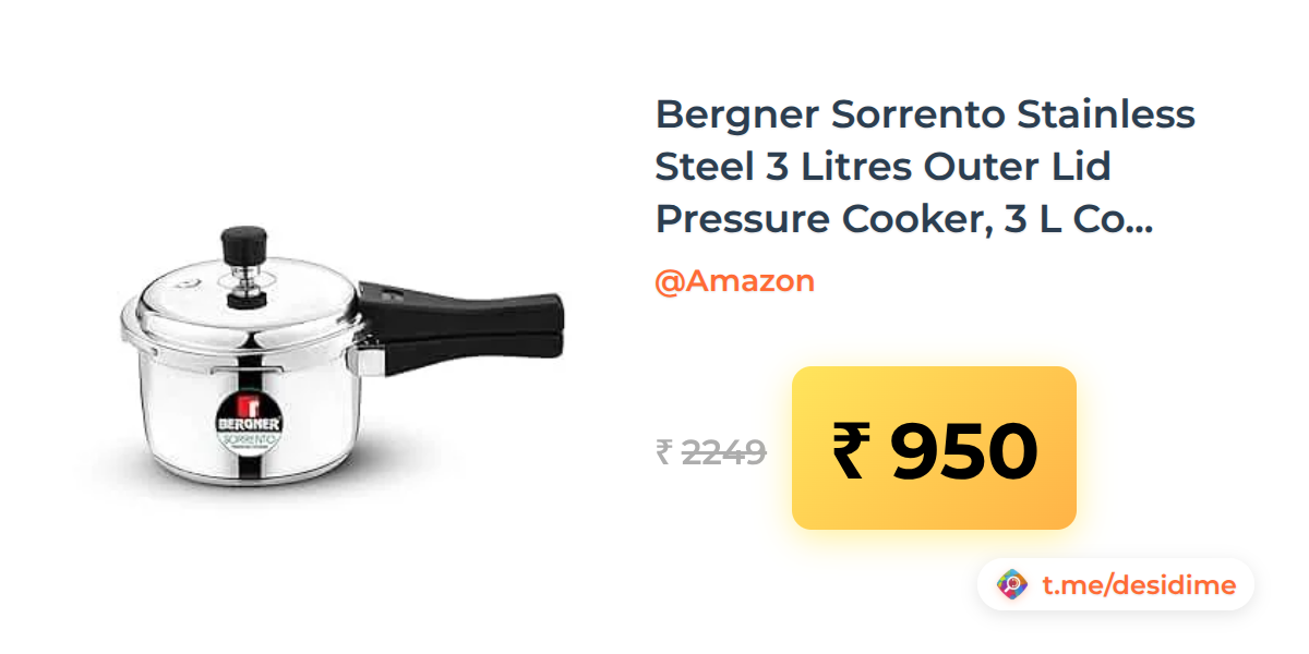 58% off on - Bergner Sorrento Stainless Steel 3 Litres Outer Lid Pressure Cooker, 3 L Cooker with Outer Lid and Triply Base, Heavy Bottom, Easy Open and Close, Healthy Cooking, Induction Bottom and Gas Stove Ready - Rs. 950